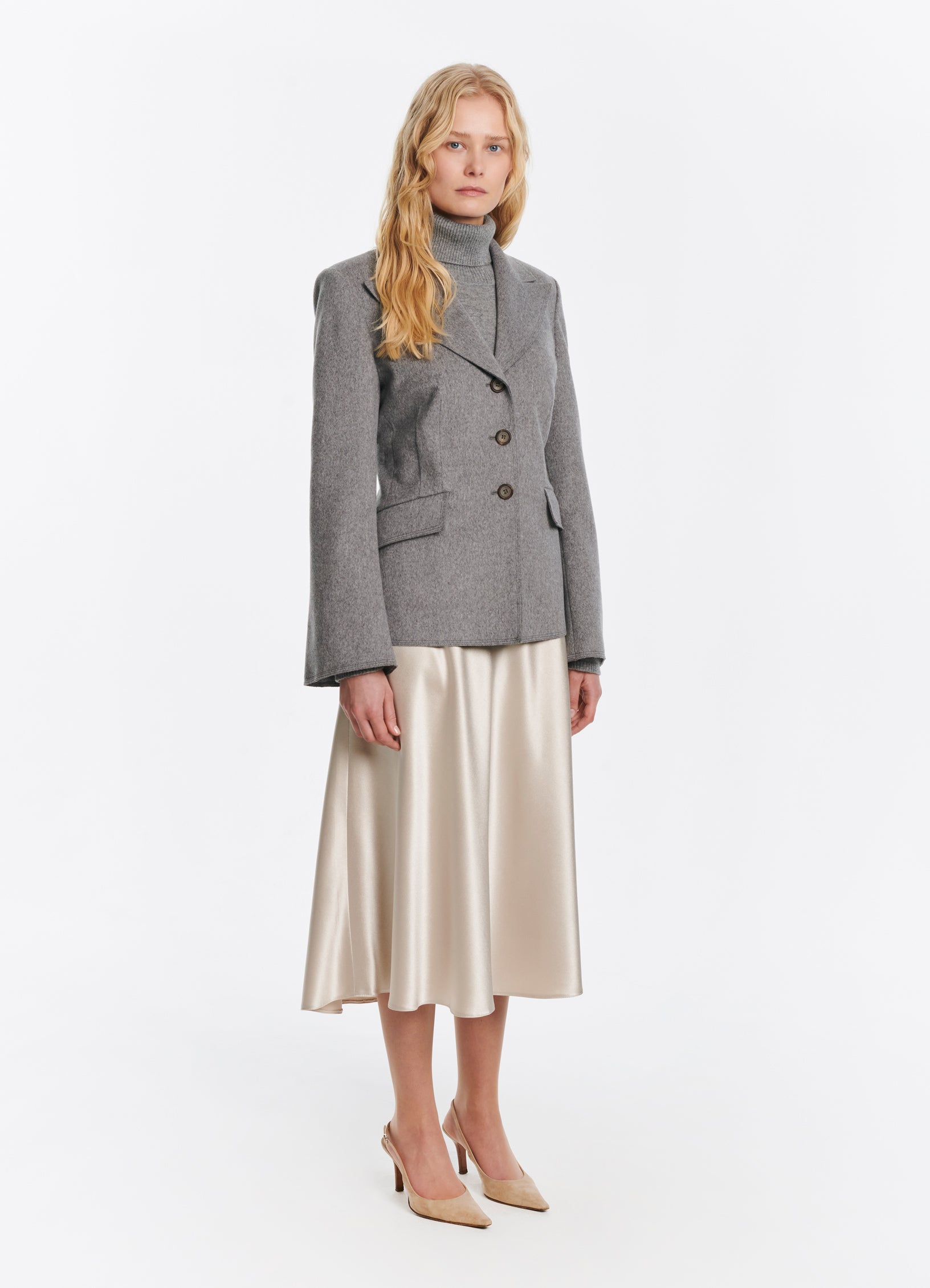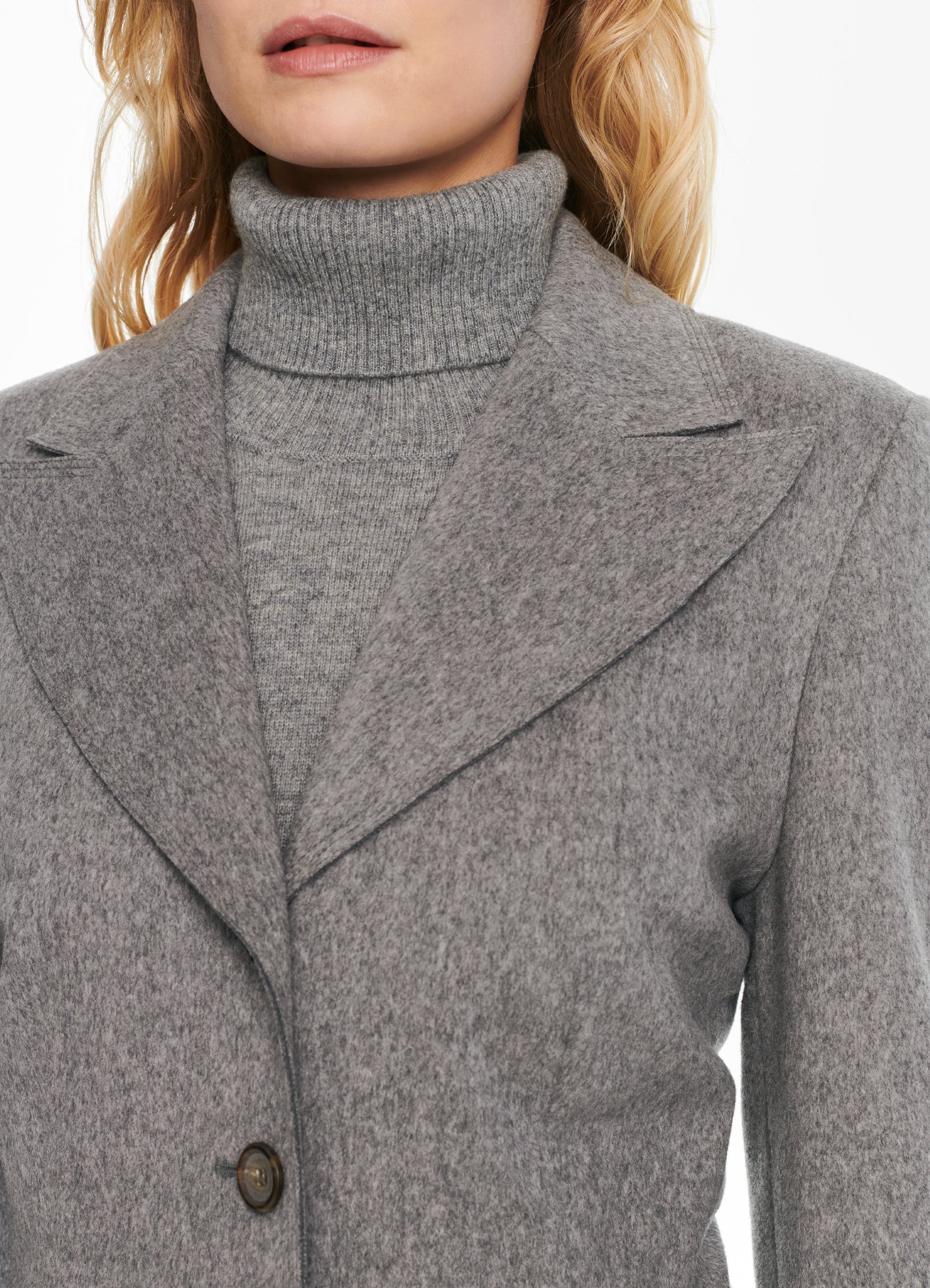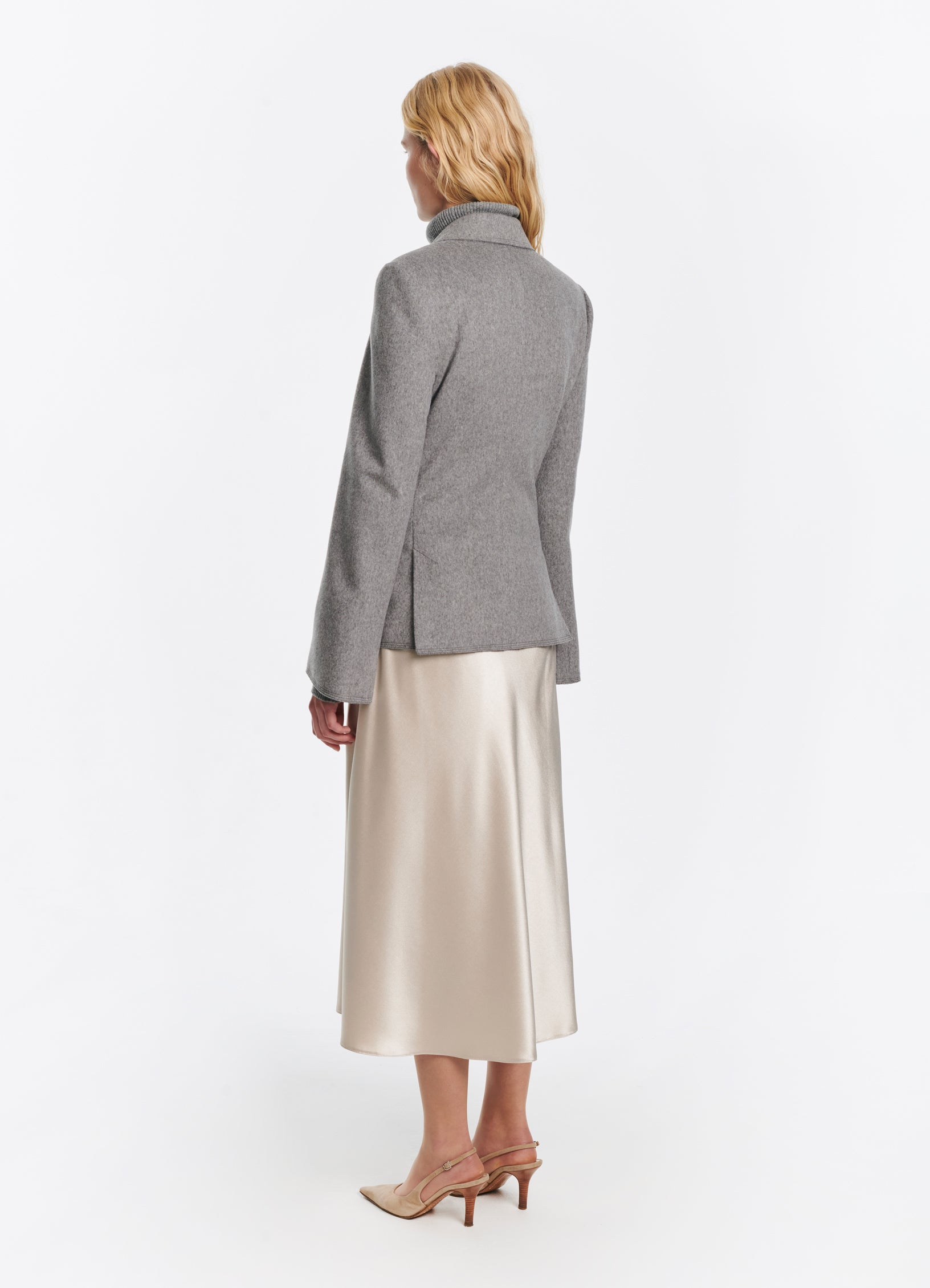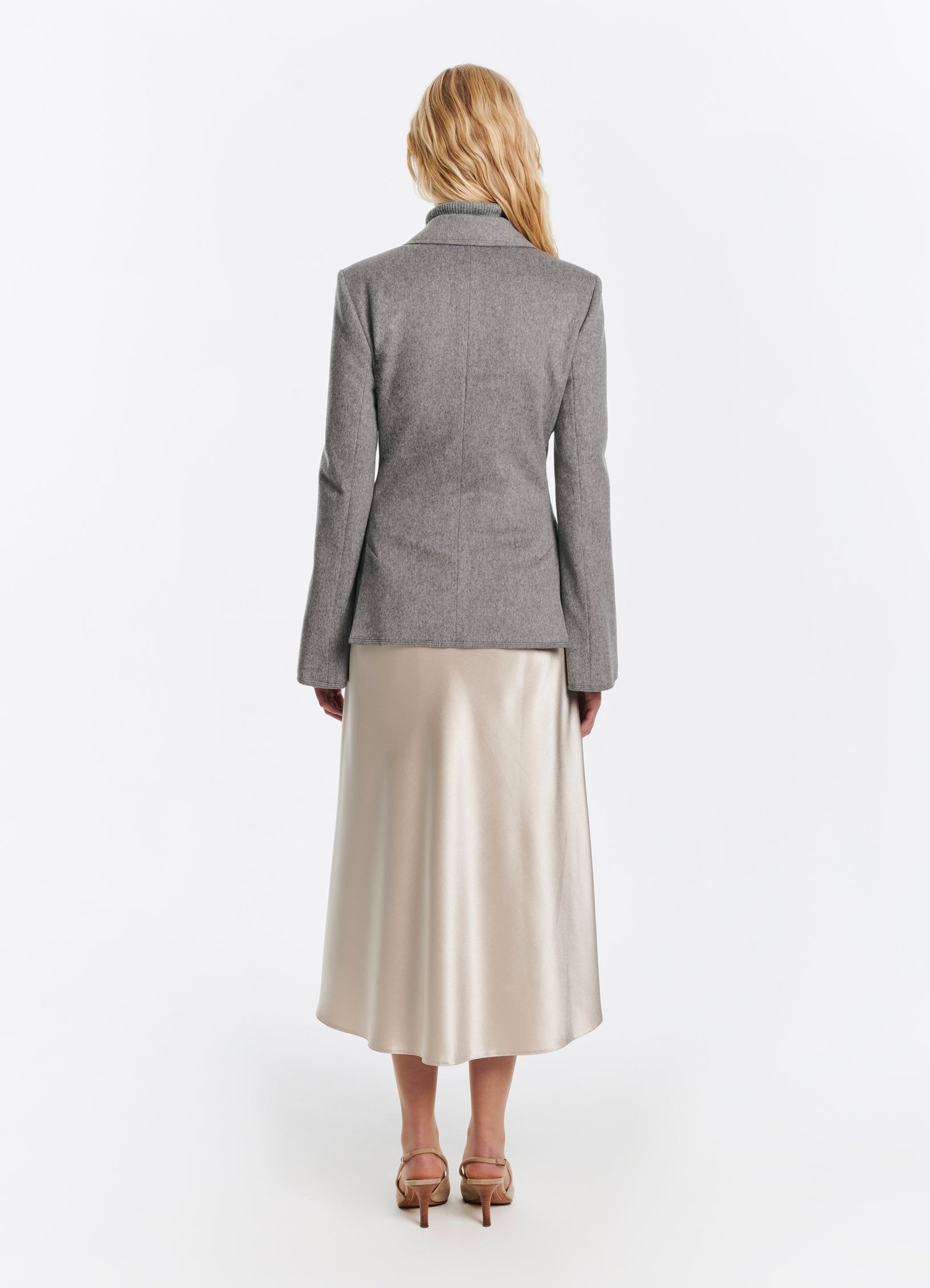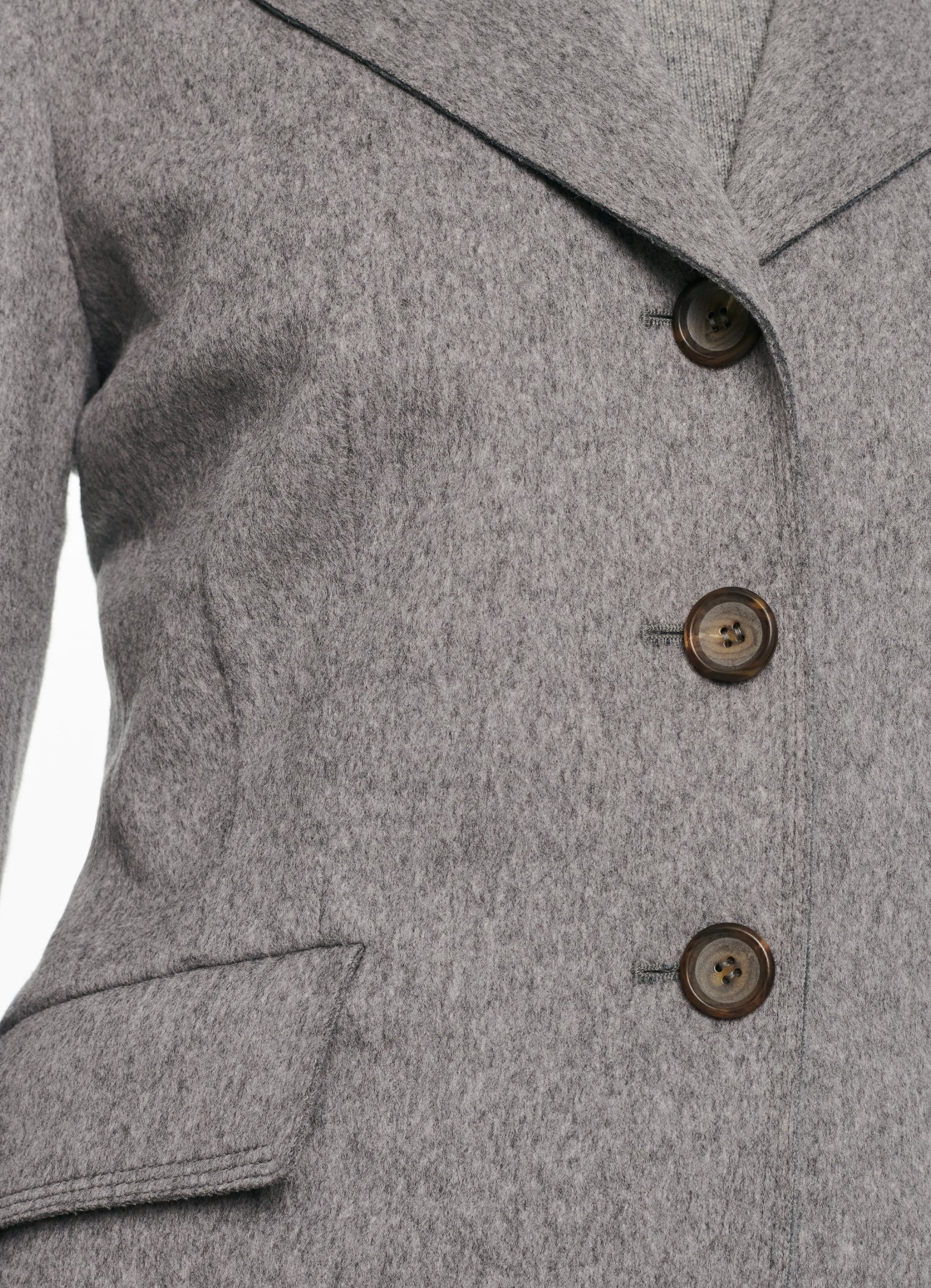 This blazer-style jacket is crafted from luxurious wool sourced from Loro Piana, renowned for its exceptional fabrics. The single-breasted design with flap pockets has wide peak lapels, padded shoulders as well as subtly flared sleeves and fastens with three buttons down the front. In a nod to menswear dress codes, it also features two back slits for ease of movement which make it particularly suitable for all kinds of journeys, whether for work or pleasure. Plus, the grey melange hue ensures this style will never go out of fashion.