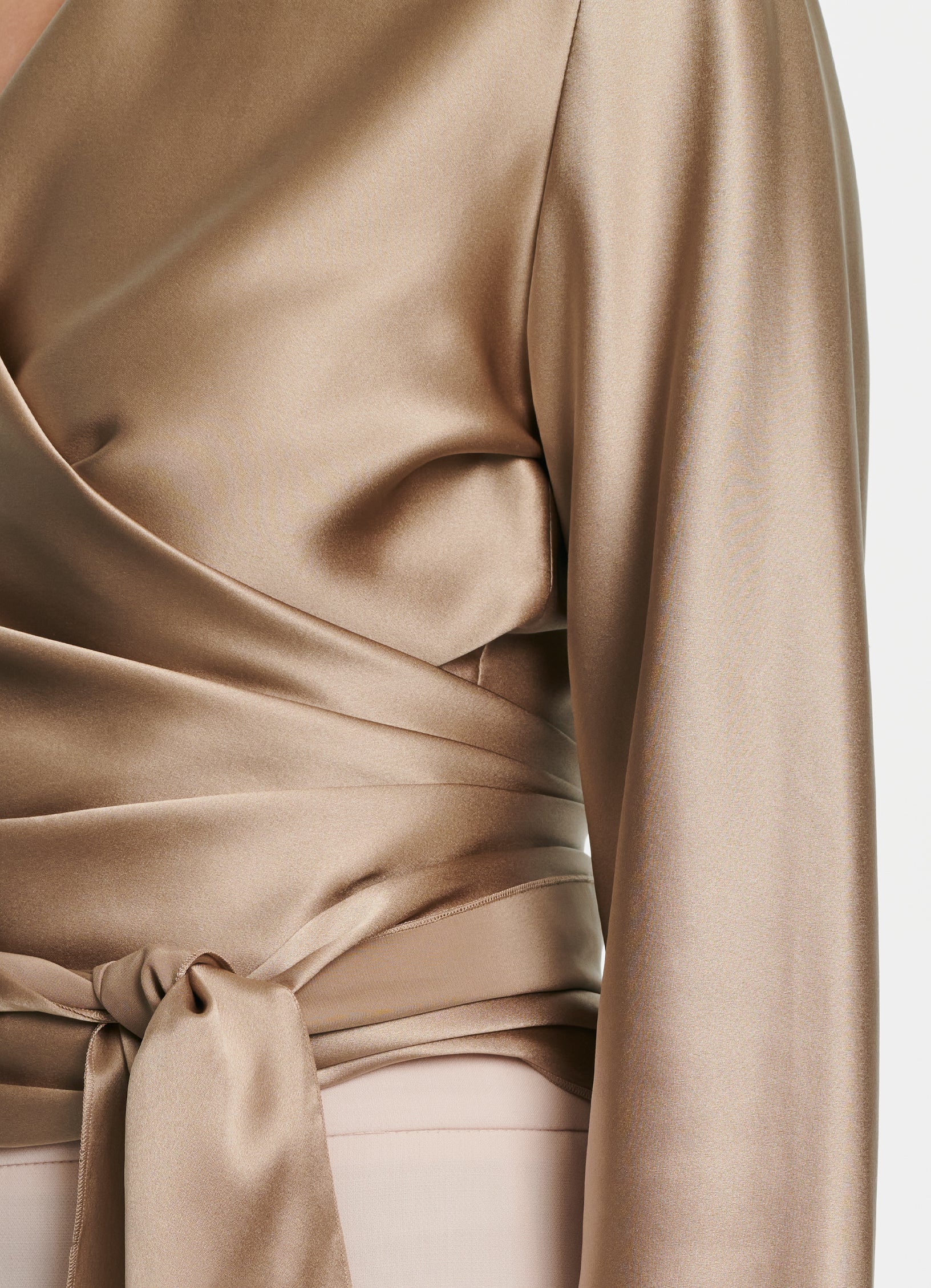 Made from 100% silk in a chic beige hue, this wrap blouse is designed to contour various body shapes and sizes – simply tie it at the front or back to find your perfect fit. The elegant V-neckline reveals a hint of skin, while the loose-fitting sleeves hit right at the knuckles. Whether dressed up with a pair of smart trousers or paired with a flowing skirt for a more casual look, this style will elevate any outfit.